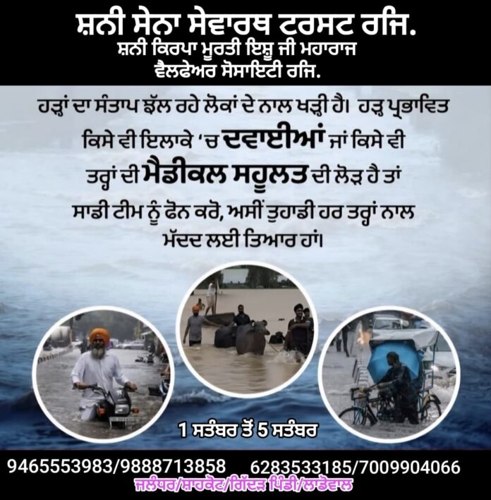 पंजाब ब्यूरो :- पंजाब में आई बाढ़ से जनजीवन बुरी तरह प्रभावित हो रहा है, खासकर गांवों के लोगों को भारी नुकसान का सामना करना पड़ रहा है। इस आपदा की गंभीरता को देखते हुए *शनि सेना सेवार्थ ट्रस्ट* ने राहत कार्य की जिम्मेदारी संभालते हुए घोषणा की है कि *1 सितंबर से 5 सितंबर तक जालंधर, शाहकोट, गीदड़ पिंडी और लडोवाल के नजदीकी बाढ़ प्रभावित ग्रामीण क्षेत्रों में मेडिकल सुविधा, दवाइयाँ और आवश्यक खाद्य सामग्री* उपलब्ध कराई जाएगी। शनि कृपा मूर्ति ईशु जी महाराज ने बताया कि संस्था की ओर से यह सेवा निभाई जा रही है ताकि प्रभावित परिवारों को तुरंत राहत मिल सके। उन्होंने धार्मिक, सामाजिक और राजनीतिक संगठनों से भी अपील की कि वे आगे आकर ज़रूरतमंद लोगों की मदद करें और इस कठिन समय में धैर्य बनाए रखने का संदेश दिया। ईशु जी महाराज ने कहा कि इस कुदरती आपदा में हम सभी को एक-दूसरे का सहारा बनना होगा और सहयोग की भावना से ही मुश्किलों को आसान किया जा सकता है। ट्रस्ट और वेलफेयर सोसाइटी के सभी मेंबरों को उनकी ड्यूटी स्थल पर तैनात कर दिया गया है ताकि हर ज़रूरतमंद तक मदद समय पर पहुँच सके।